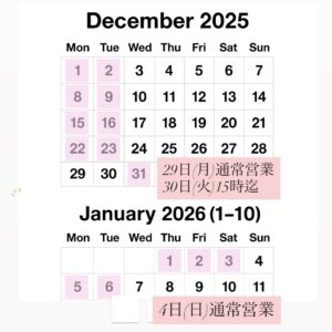 休業日の前後はご希望のお時間の予約が取りにくい事がございますのでお早めのご予約をお待ちしております‼︎